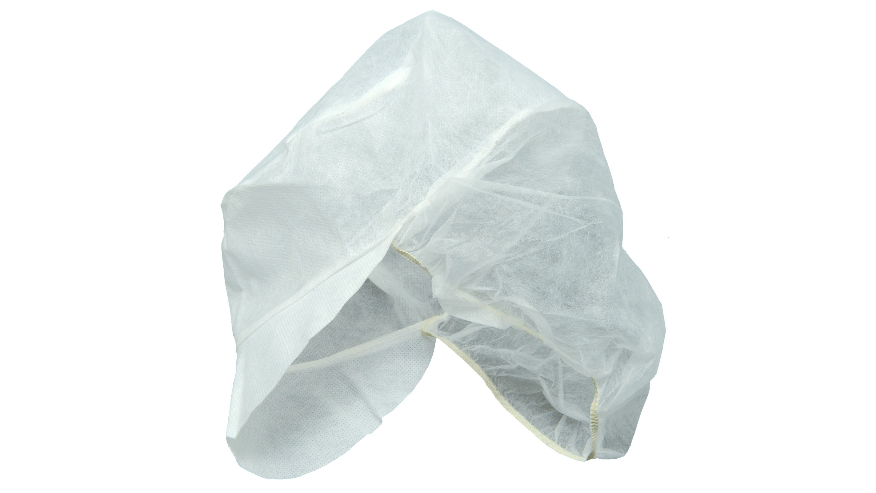Schild-Mützen SIR aus starkem, waschbarem, weissem Non-Woven-Vlies. Praktische, bequeme Kopfbedeckung, geeignet für jede Kopfgrösse, optimaler Hygiene- und Nackenhaar-Schutz.