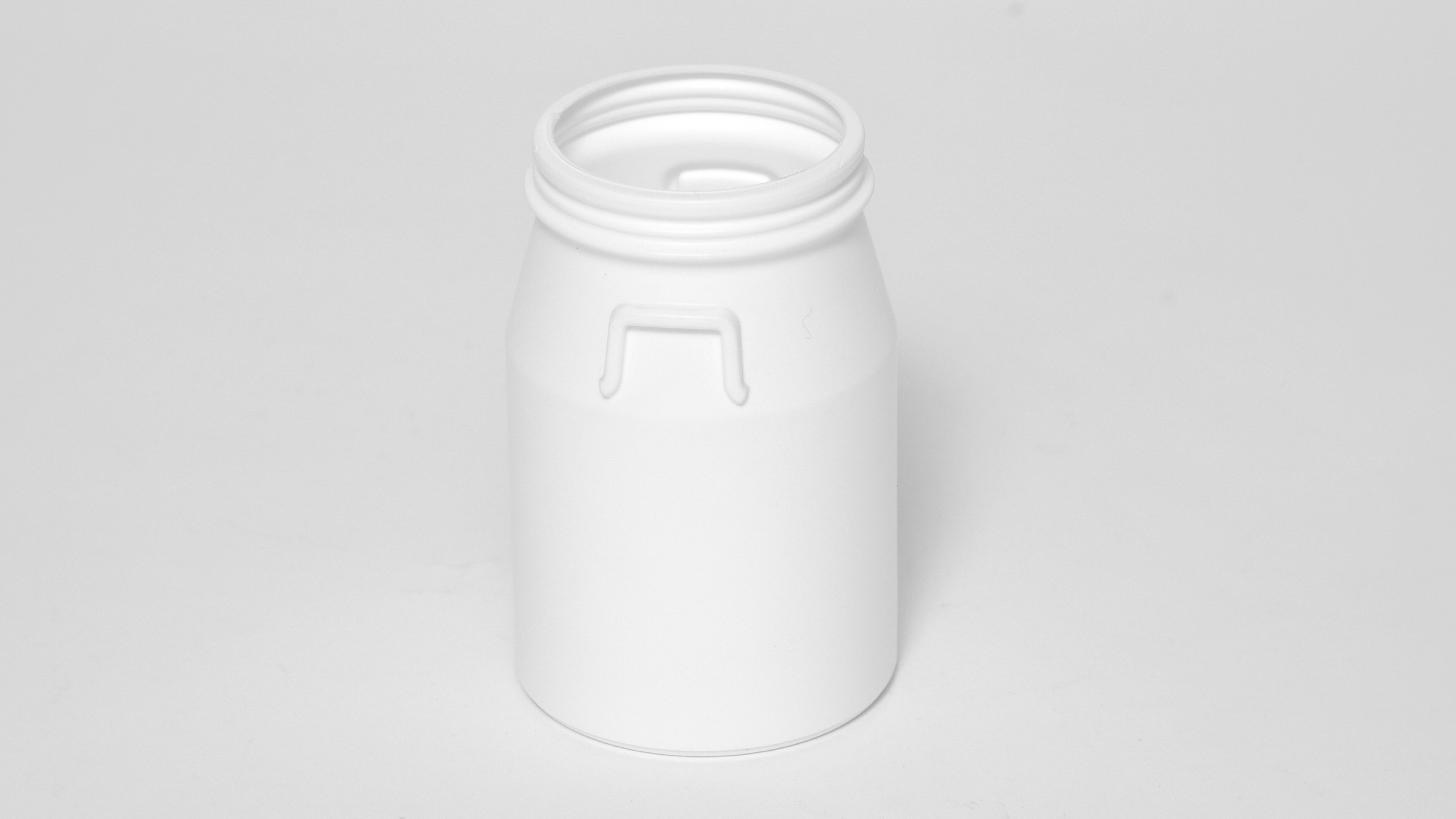 Weithals-Flasche Panna aus weissem Kunststoff PE, geeignet für Jogurt, Rahm und Saucen, Schnappverschluss, Halsöffnung Ø 54 mm, Volumen 200 ml
