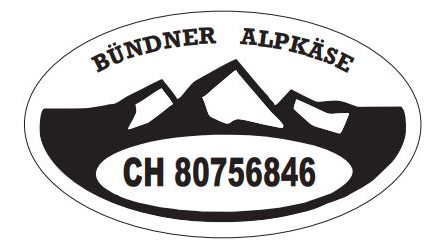 Vignettes en caséine opaque ovale 60 x 105 mm, spéciaux imprimé noir "Bündner Alpkäse" (écriture miroir).