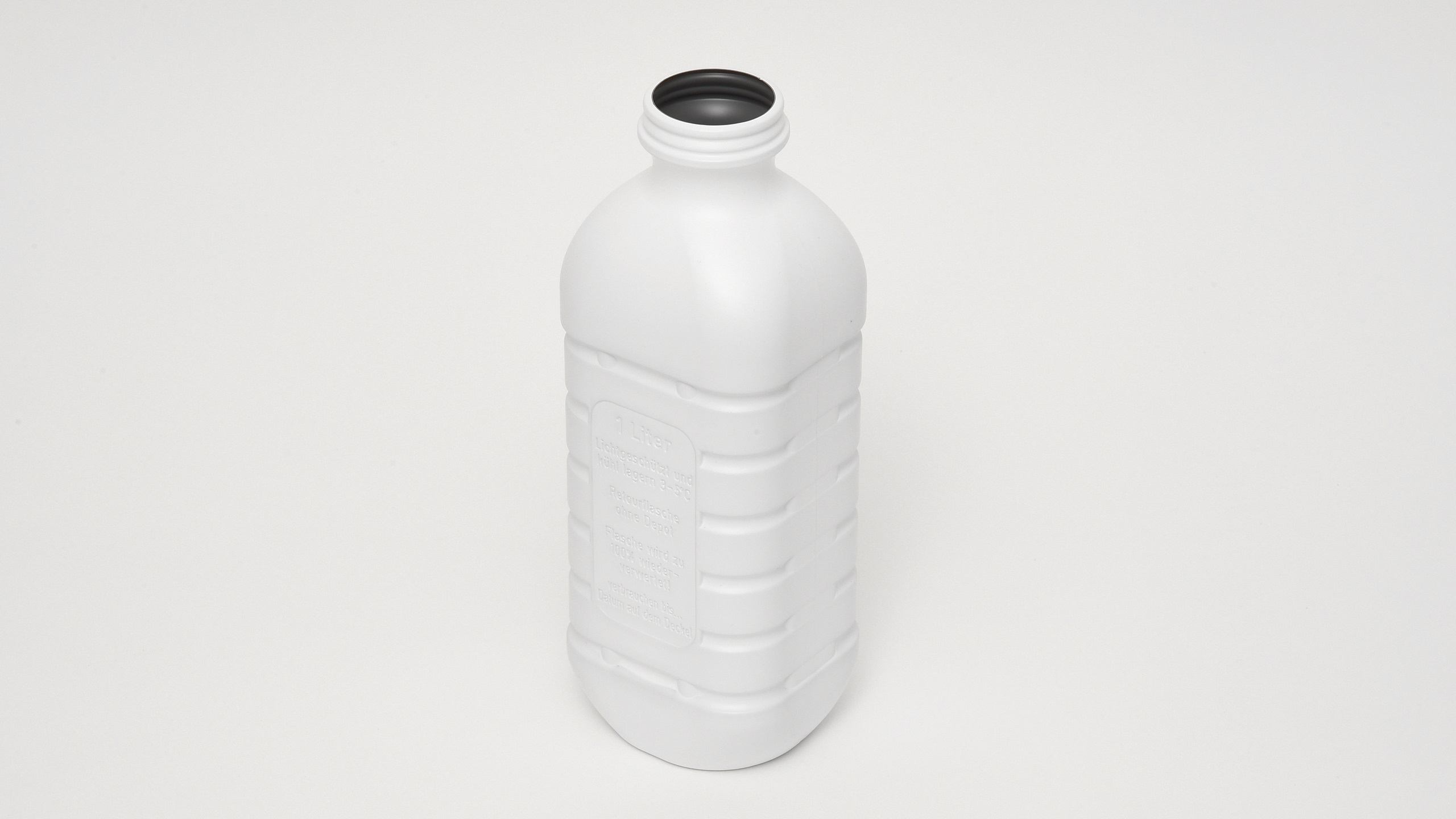 Einwegflasche alpla aus weissem Polyethylen, innwendig dunkel eingefärbt, geeignet für Milch, Rahm und Saft, Schnappverschluss, Halsöffnung Ø 43 mm, Volumen 1 Liter