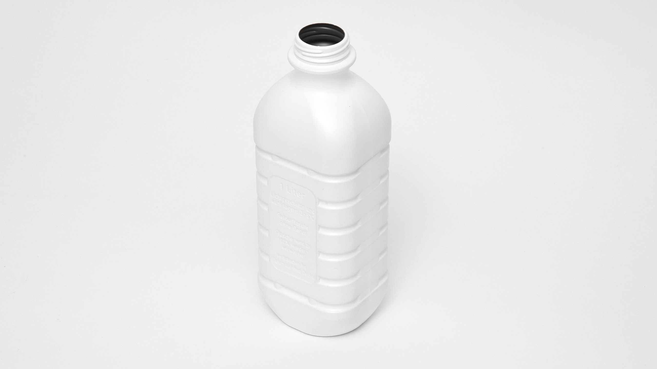 Einwegflasche alpla aus weissem Polyethylen, innwendig dunkel eingefärbt, geeignet für Milch, Rahm und Saft, Schraubverschluss, Halsöffnung Ø 38 mm, Volumen 1 Liter