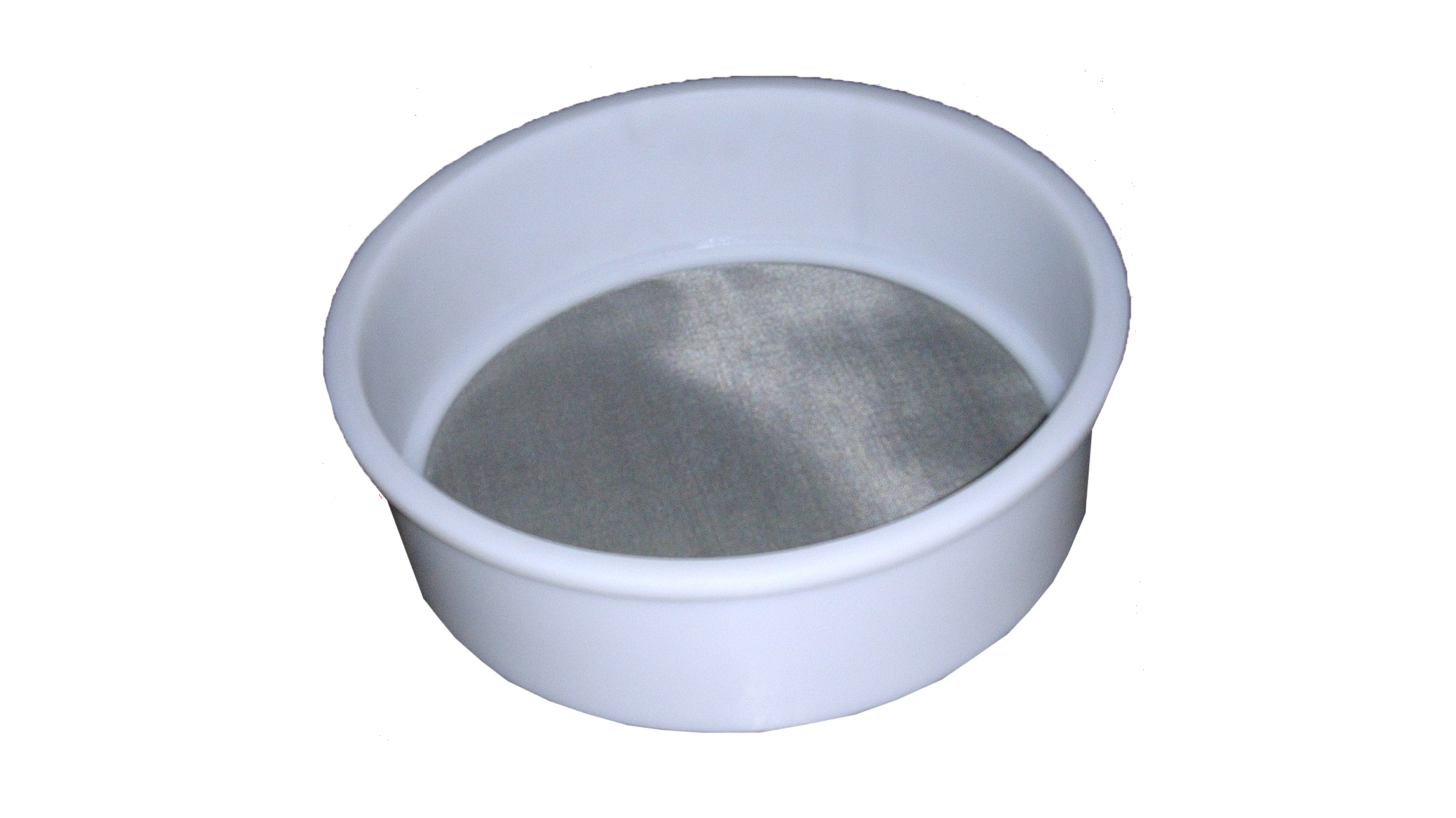 Milchfolle aus weissem Kunststoff Polyethylen, oben mit Aufliegegrand, aussen mit Spritzschutz auf halbem Umfang, Siebgewebe aus Chromnickelstahl, aussen Ø 35 cm