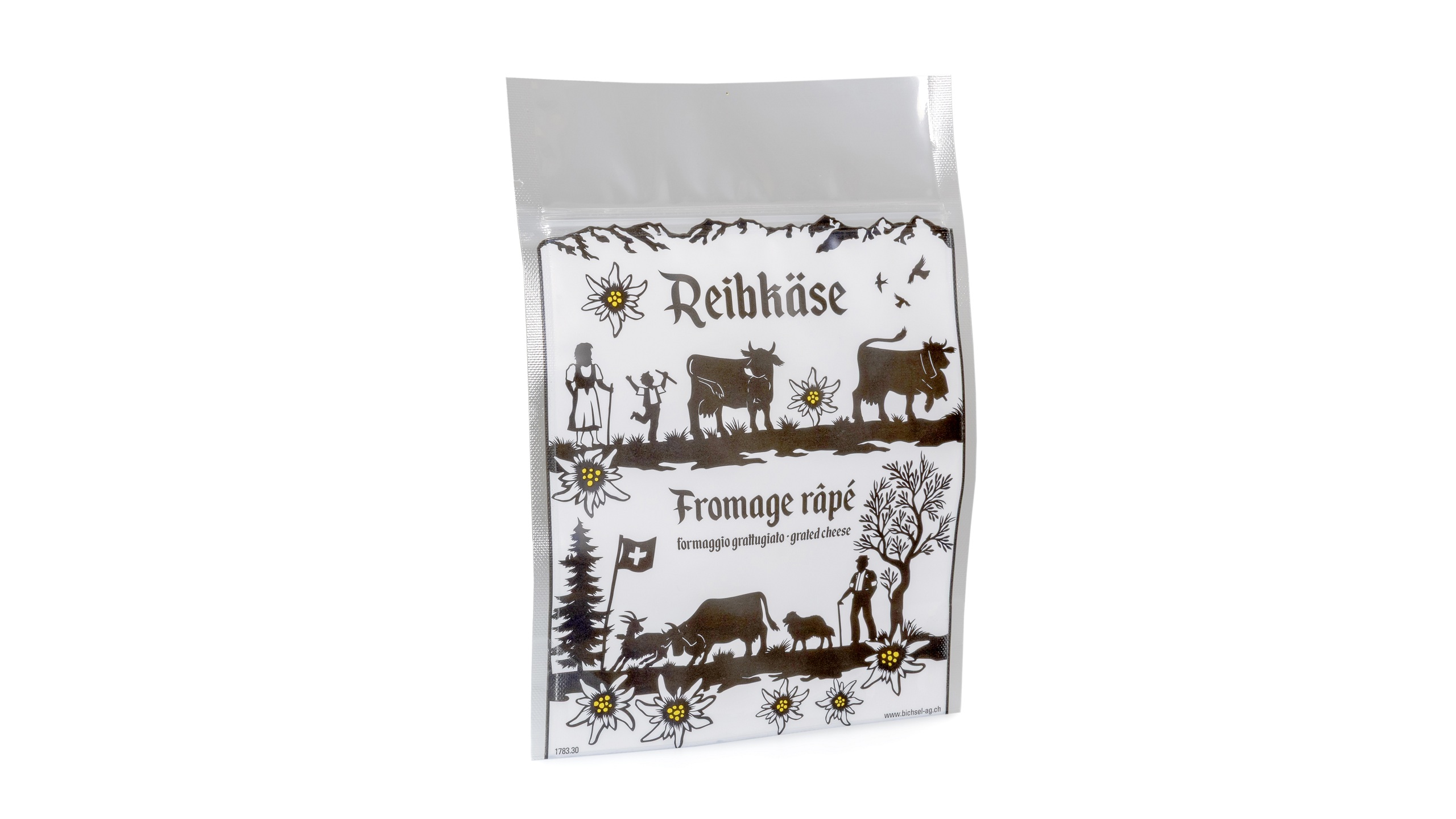 Vakuum Stehboden Beutel für Reibkäse, Wiederverschluss mit Zipper, schwarz bedruckt mit Sujet Scherenschnitt, Grösse 160 x 225 mm